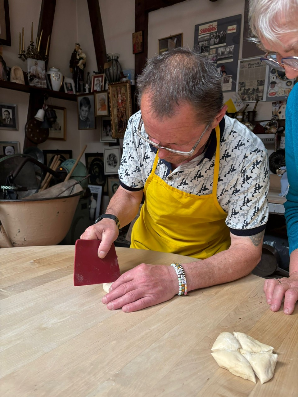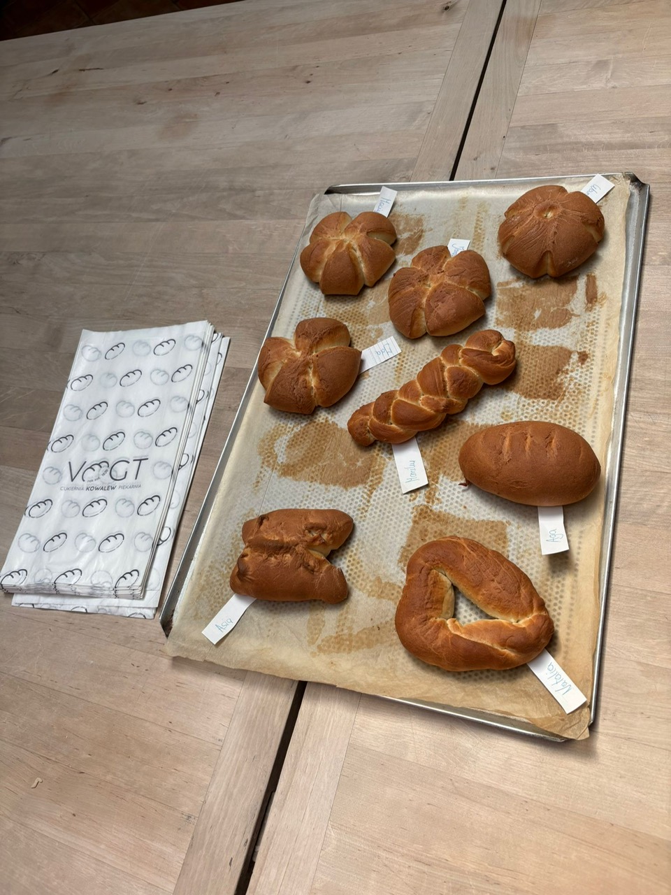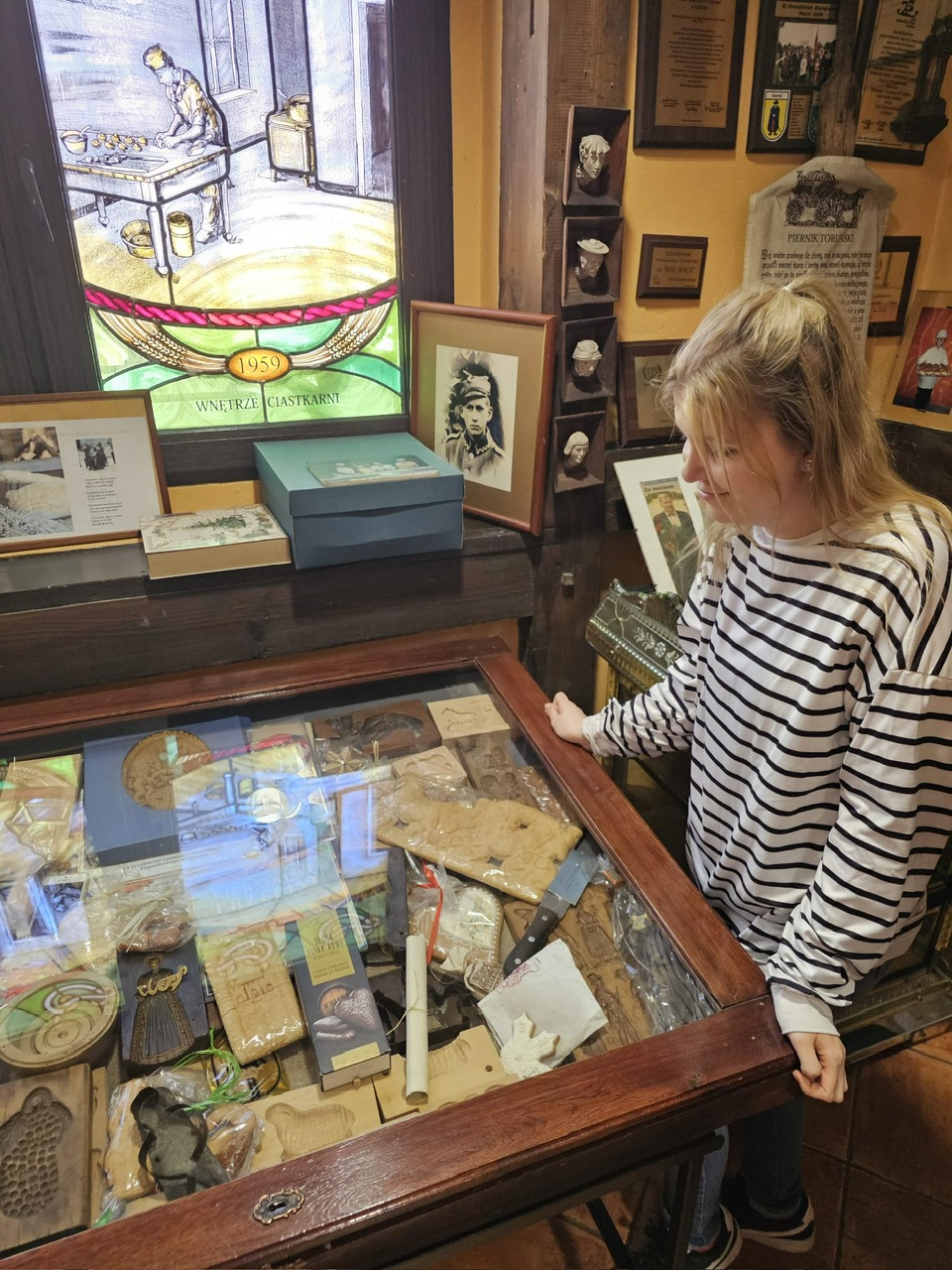 Podczas wizyty była prelekcja dotycząca historii piekarnictwa, zapoznanie z dokumentami, fotografiami sprzed lat oraz warsztaty wypieku bułeczek i ciastek.